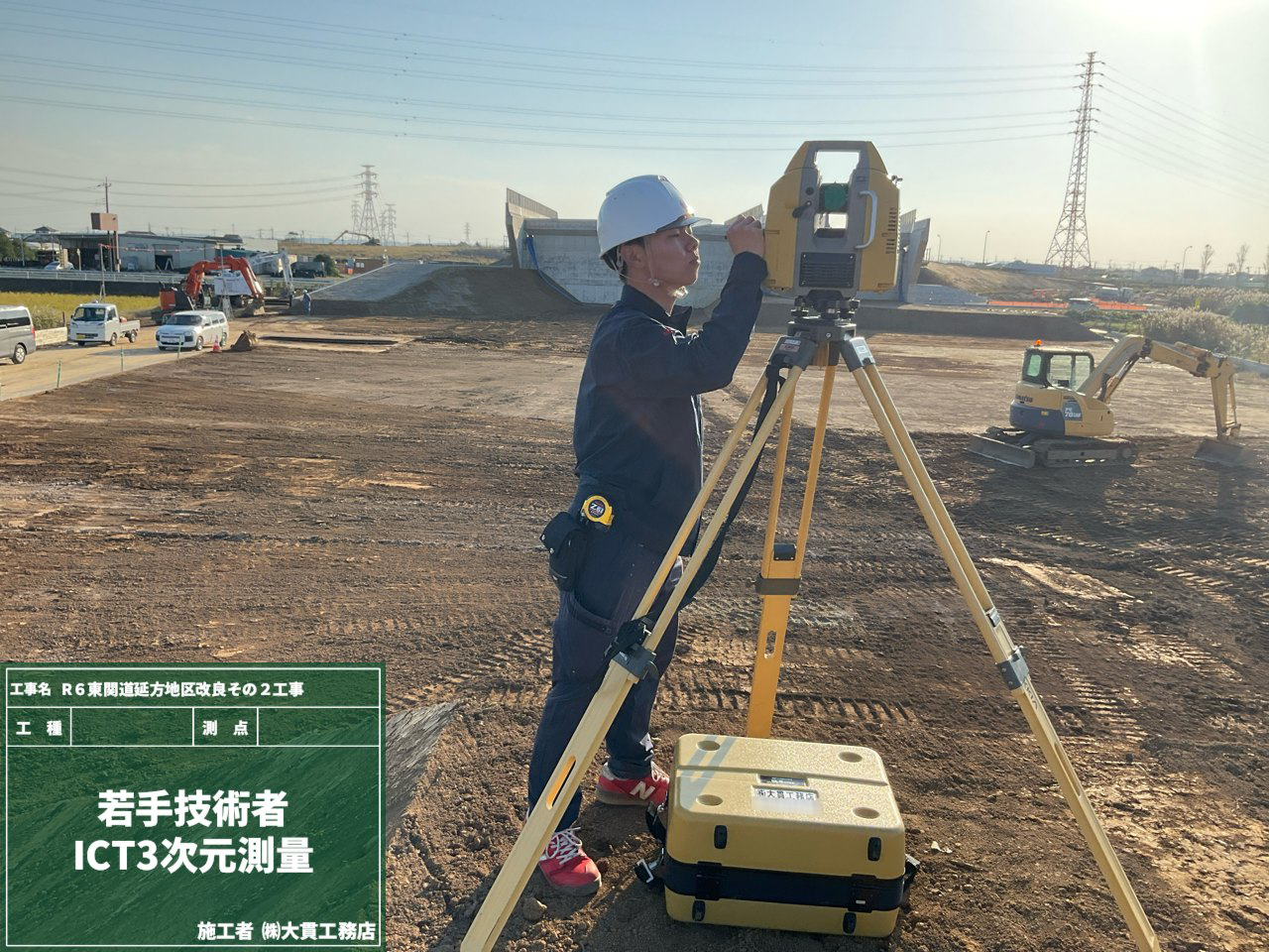 そして、こちらは若手技術者がICT技術を使って測量と出来形確認に挑戦中です💪