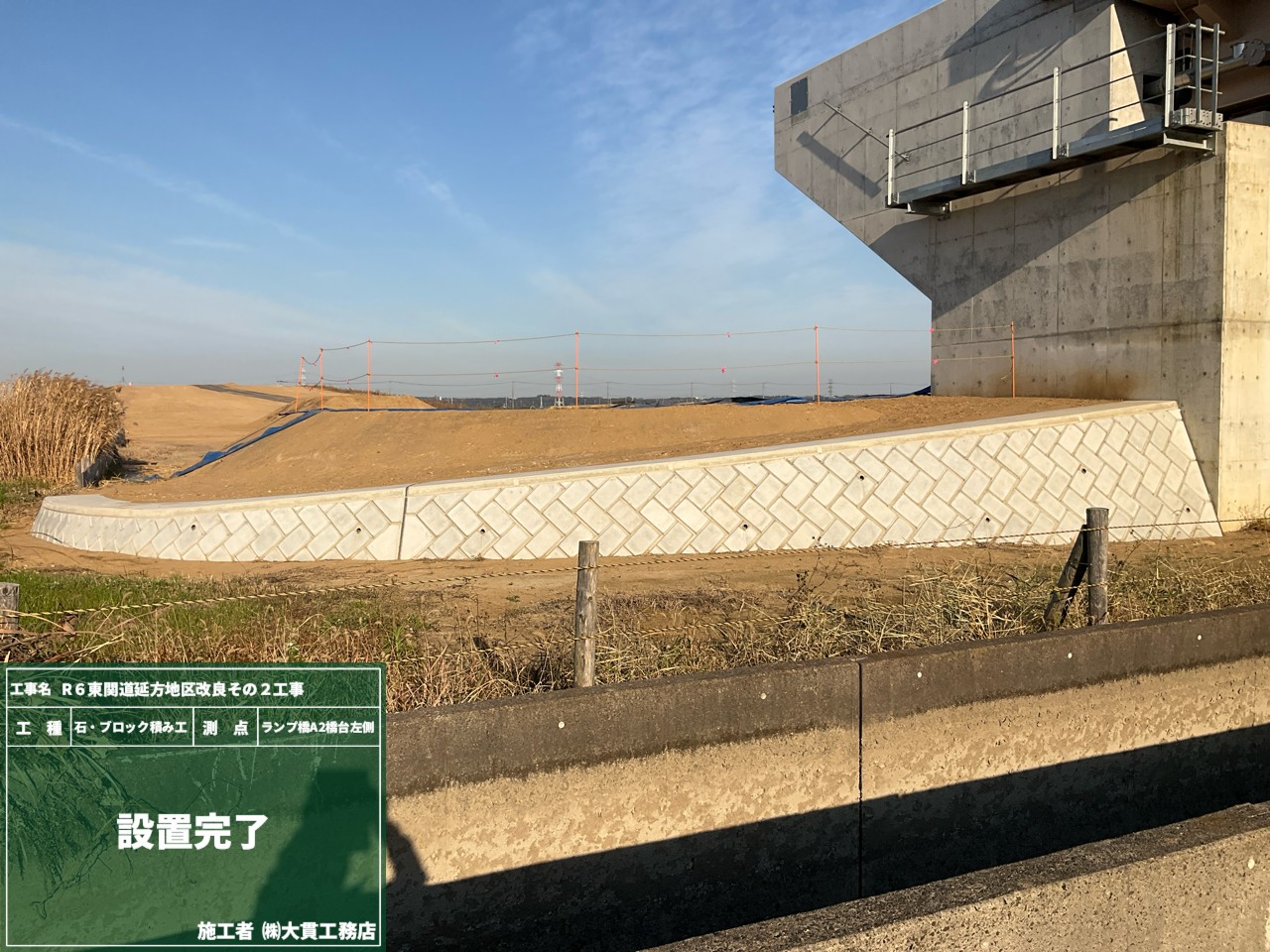 また、完成した擁壁に不要に近づかないように、目印としてコーンも設置しました。