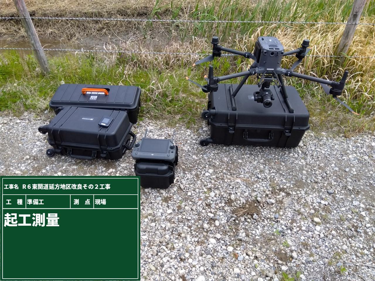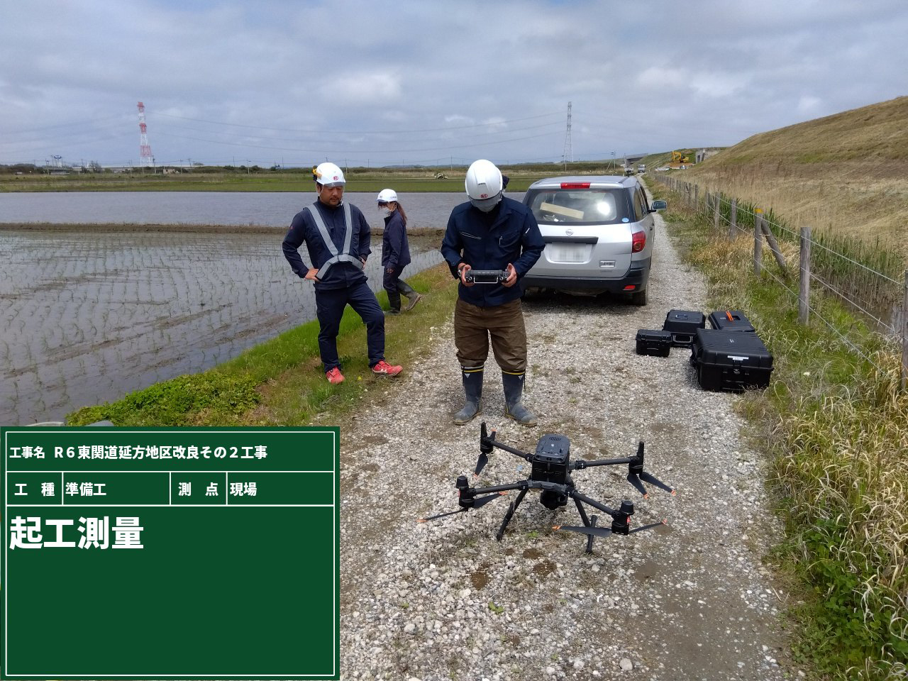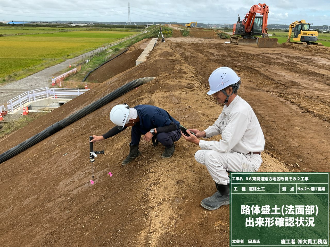 そして、こちらは若手技術者がICT技術を使って測量と出来形確認に挑戦中です💪