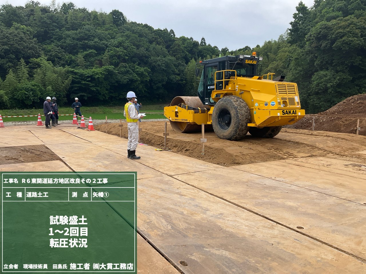 この現場はICT施工で盛土をするので、事前に転圧回数を確認しなくてはなりません。