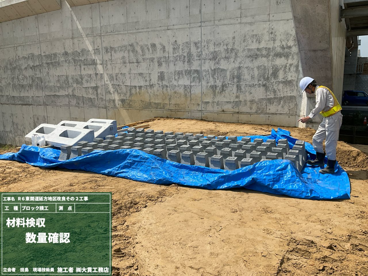 まずは現場に納入されたブロックの材料検収です。サイズ・数量・破損に問題なし!