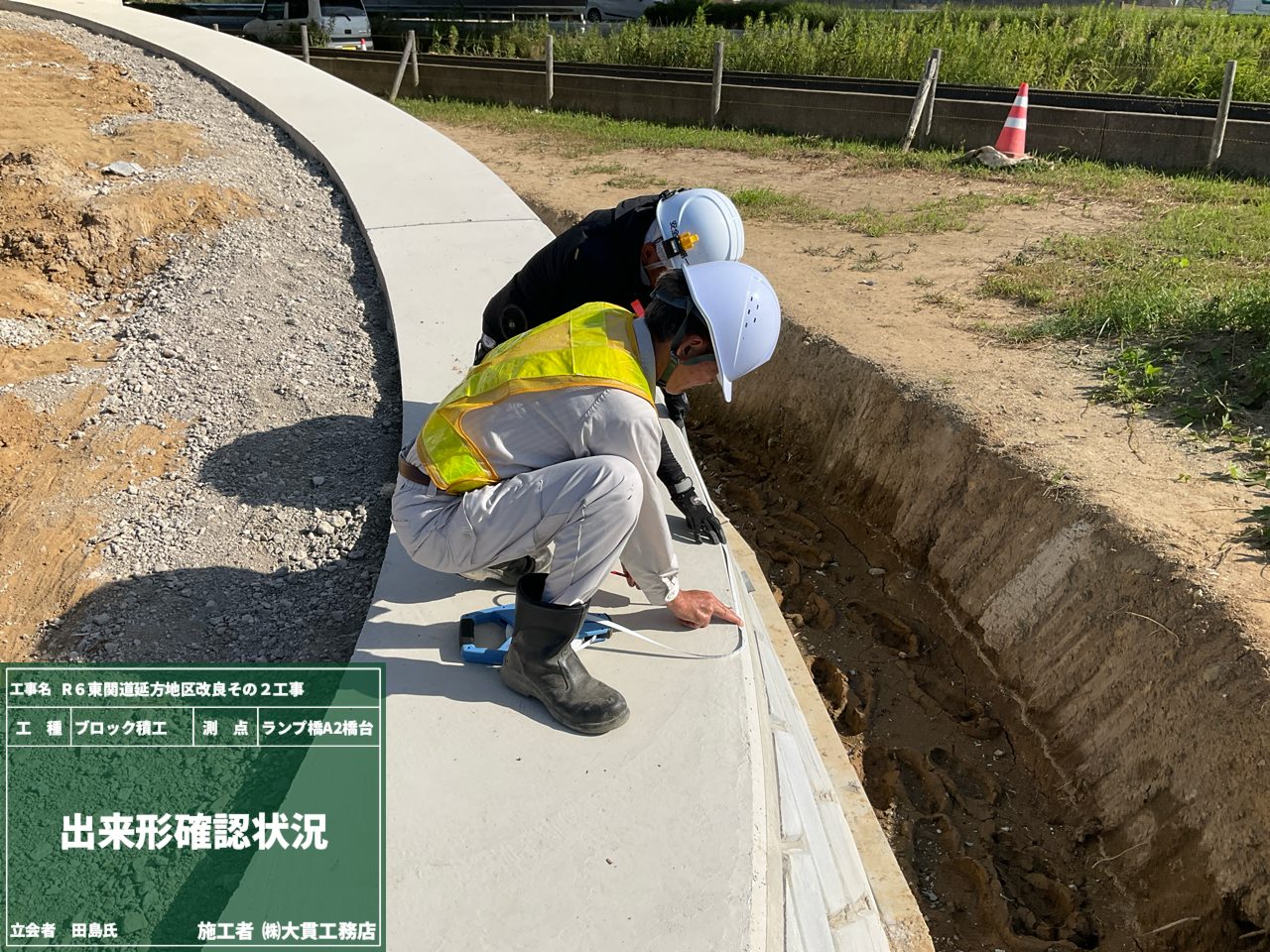 笠コンクリートの打設と養生が終わり、出来形確認をしています!