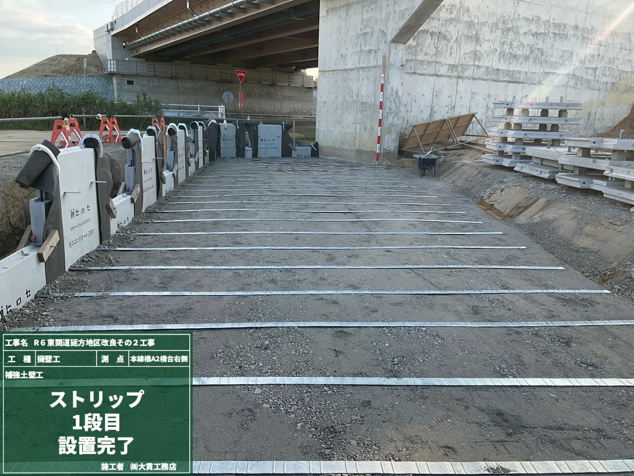 その名も「補強土壁」といって、土の中に補強材を敷いて垂直盛土をつくっていきます。