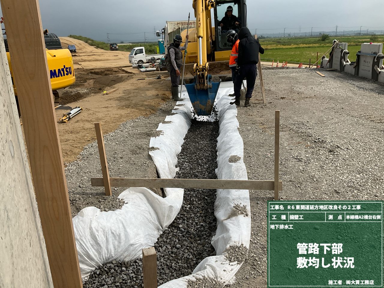 まずは土が流れないように吸出し防止材を敷き、その上に水はけの良い砂利を敷均します。