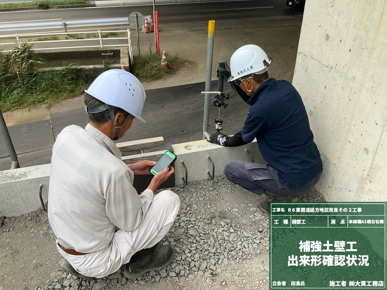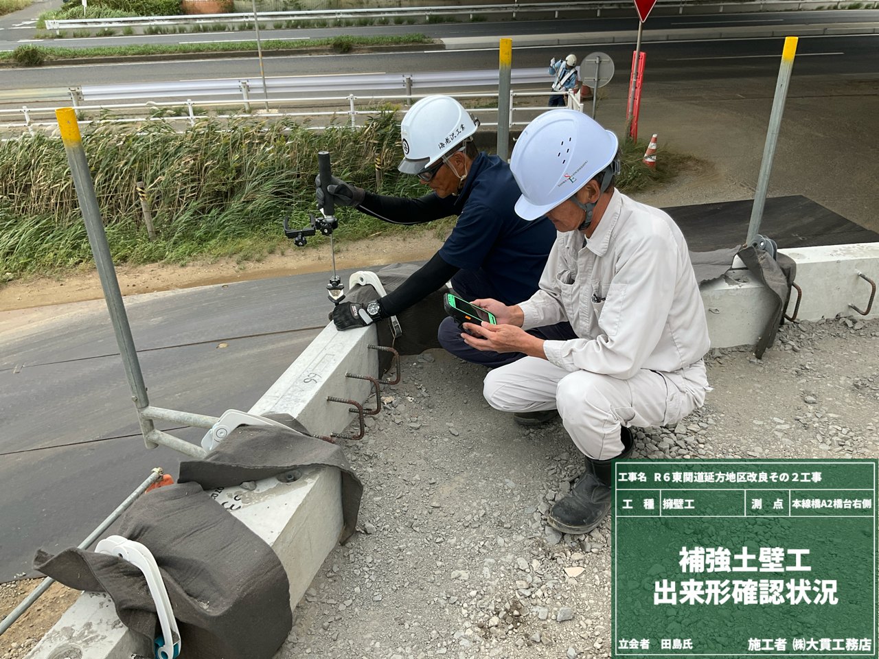 補強土壁が「設計通りに施工ができているか」をチェックする出来形確認を一部ICTで行いました。