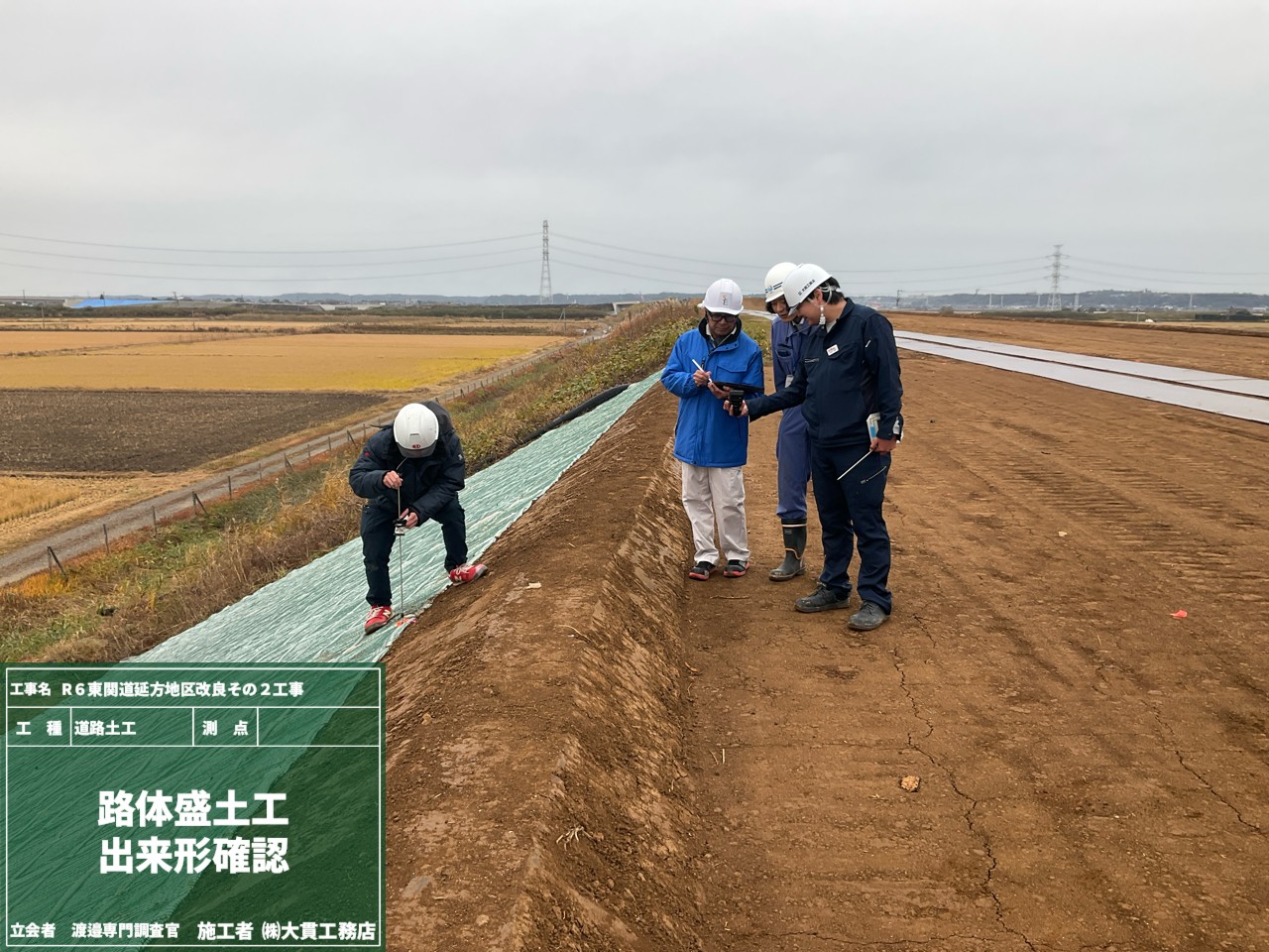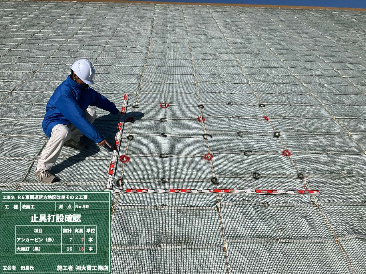 マットの長さや、マットを固定している止具(アンカーピン・大頭打)の打設本数が、設計通りに入っているかをチェックします👀