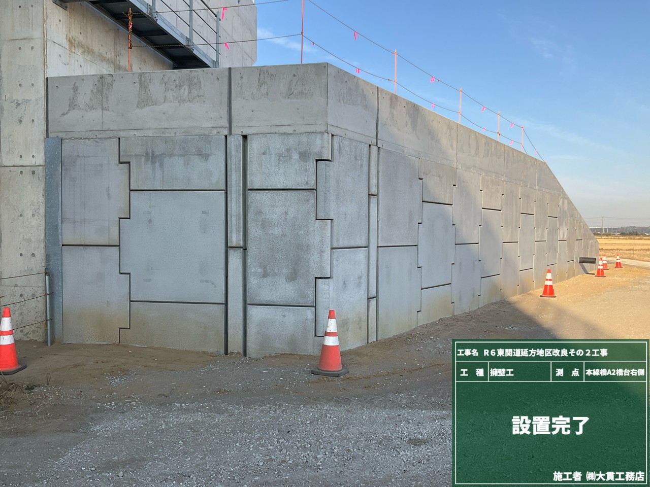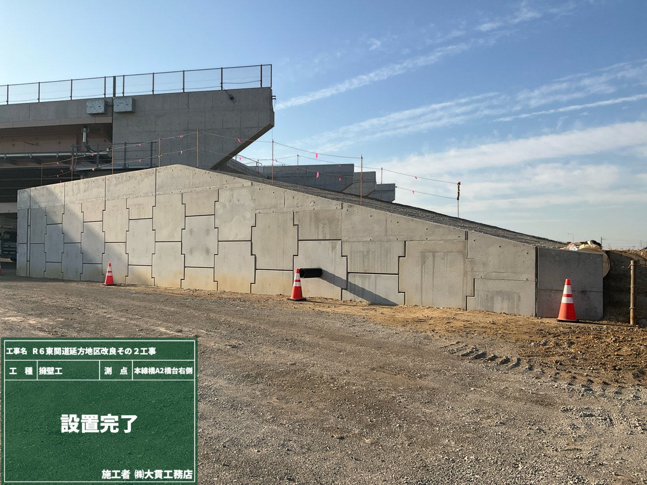 また、完成した擁壁に不要に近づかないように、目印としてコーンも設置しました。